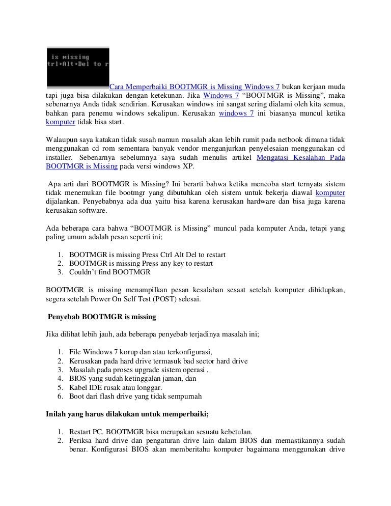 Cara Mengatasi BootMGR is Missing dengan Ganti Hard disk. Kali ini seputar teknologi akan membuat video Solusi Mengatasi BOOTMGR is missing Pada Laptop dan KomputerSolusi Mengatasi BOOTMGR is missing Pada Laptop dan. Pesan BOOTMGR is missing terjadi ketika komputer baru dinyalakan namun sistem tidak bisa menemukan file BOOTMGR yang dibutuhkan.